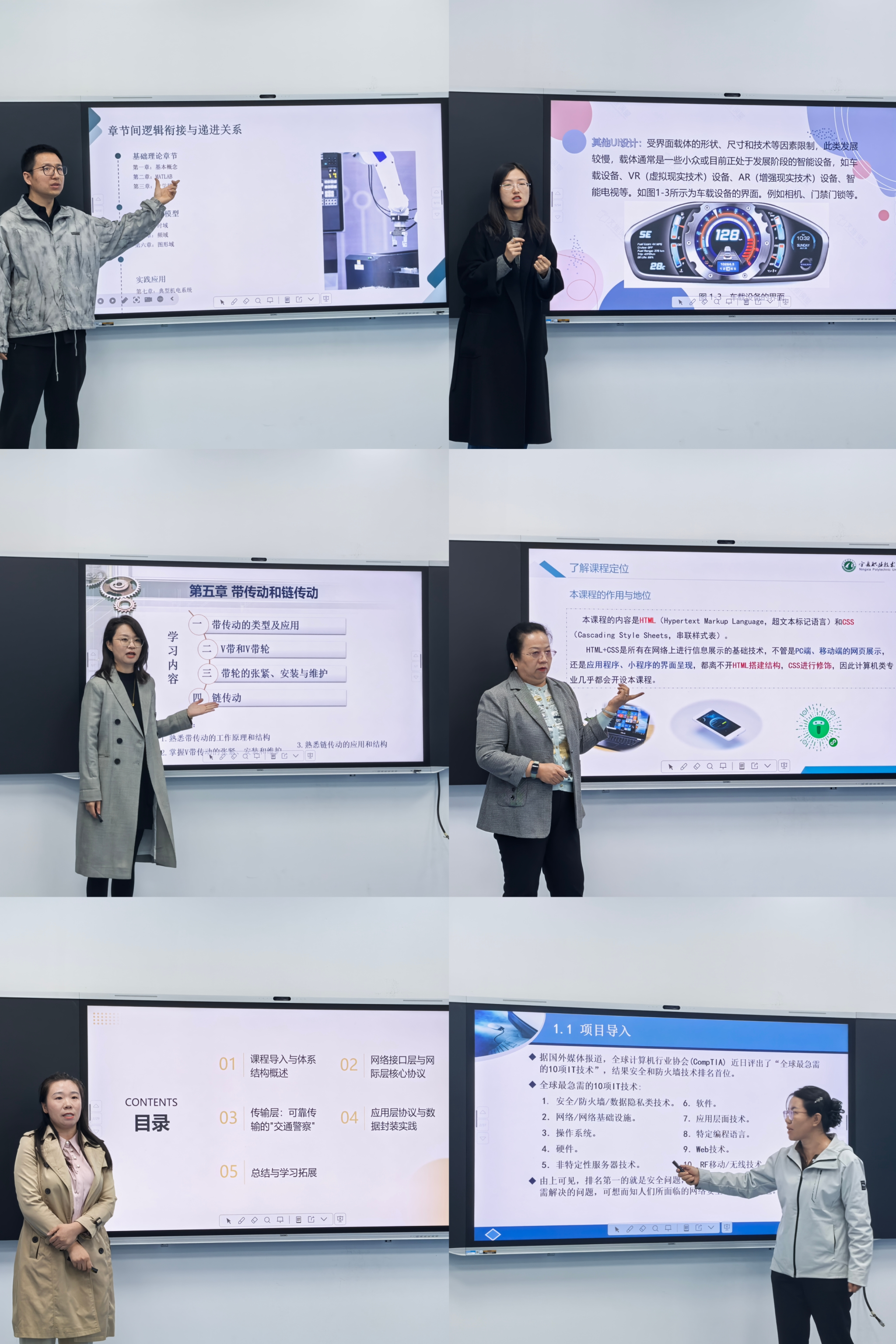 试讲过程中,6 位新教师围绕各自专业的核心课程精心设计教学内容,以饱满的热情、清晰的逻辑展开试讲。每位教师从课程导学、过程辅导和课程思政教学设计等模块入手,通过图片展示、动画演示、情景代入、案例分析等方式开展教学演示,展现出良好的教学潜力与专业素养。