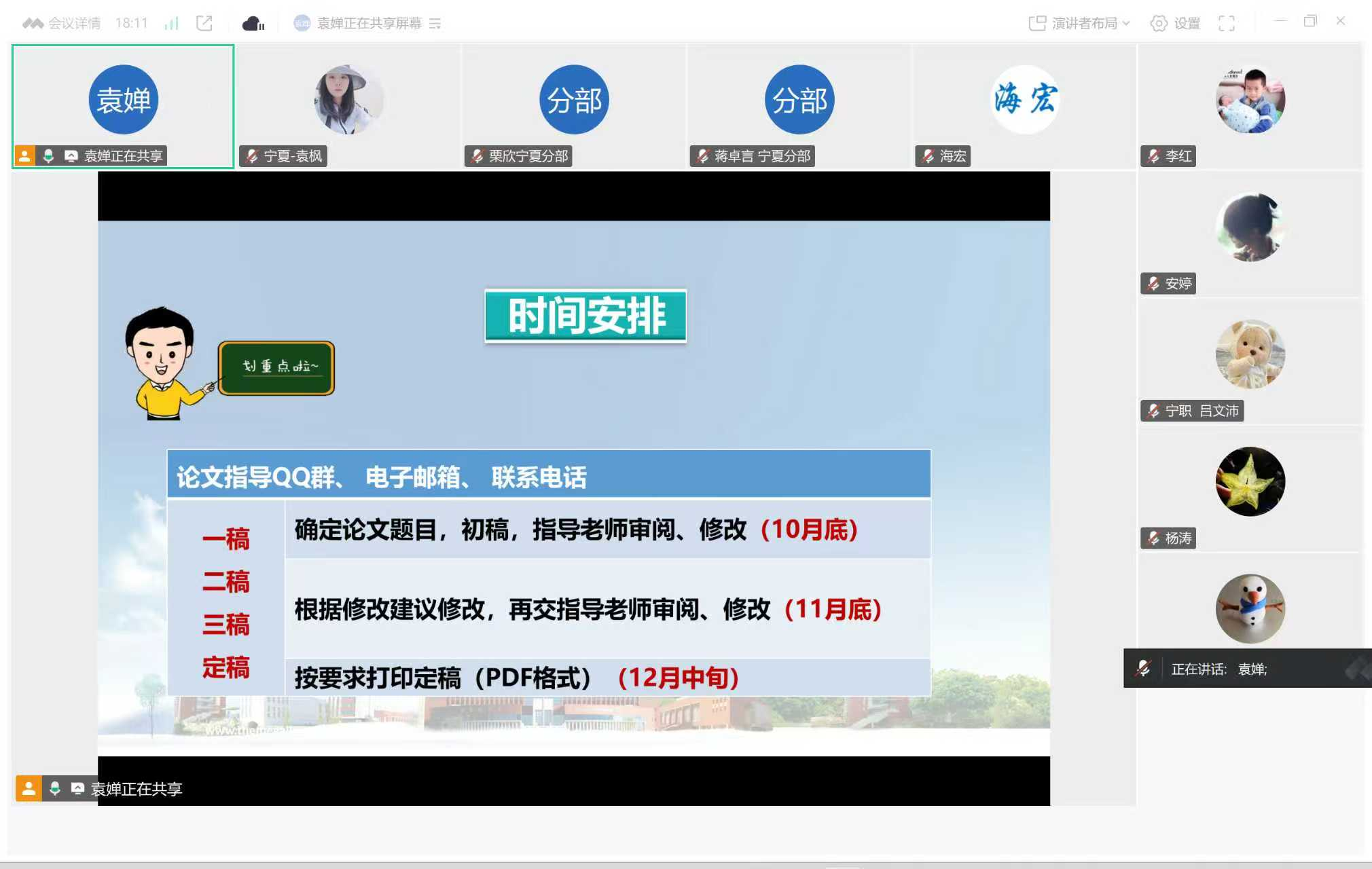 随后,袁婵老师就本学期学生提交论文的各环节时间节点与质量要求进行了明确部署。她要求全体指导老师务必严格把握进度,督促学生按时、保质完成开题、初稿、修改稿和终稿的提交工作,确保整个论文指导环节有序、高效推进。