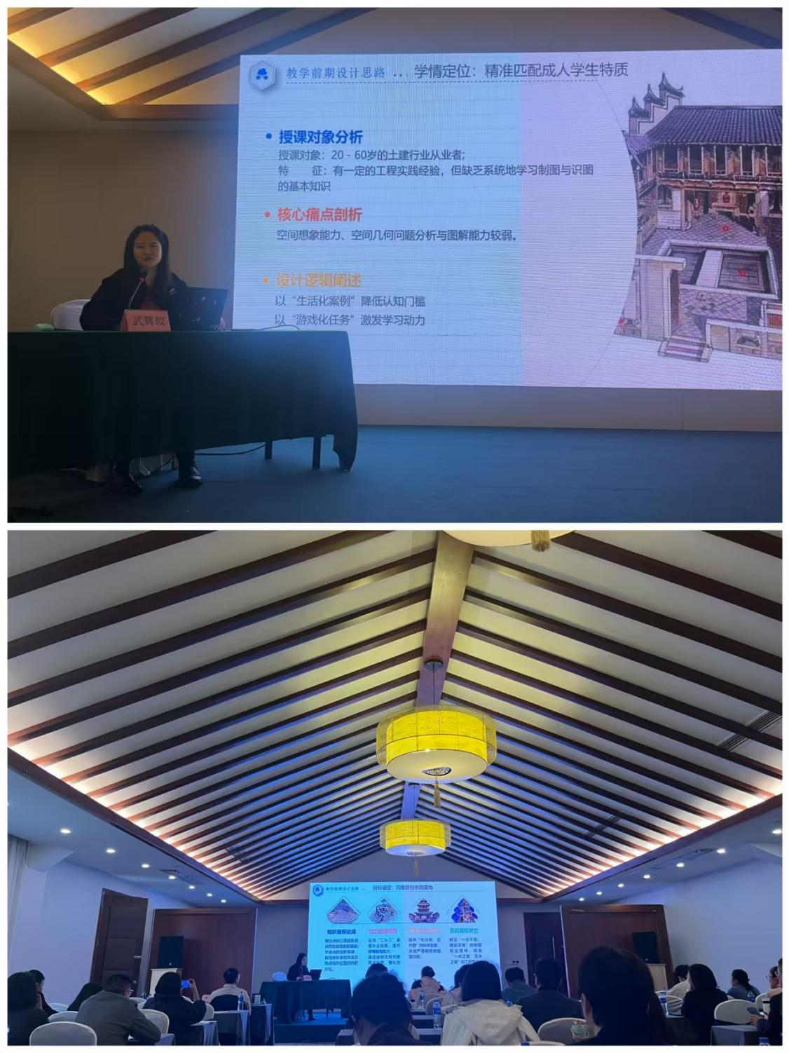 当日下午,宁夏开放大学土建类专业教师武辉皎聚焦土建类基础课程教学创新,以“以境促学,以玩促练:建筑制图基础教学实践探索”为题作分享,重点突出AI技术在教学中的创新应用。针对土建类专业学生学习建筑制图时空间想象能力薄弱、学习兴趣不足等痛点,武辉皎老师介绍了团队打造的“AI+教学”新模式:通过AI数字人讲述建筑制图相关历史故事,生动导入课程内容;借助AI技术设计“大富翁闯关”等互动游戏,将抽象的制图知识转化为趣味化练习;帮助学生快速理解空间结构。为全国土建类专业基础课程教学改革提供了可借鉴的实践经验。
